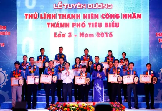 Lãnh đạo TPHCM chúc mừng 40 “Thủ lĩnh thanh niên công nhân TPHCM” năm 2016 . Ảnh: Tuấn Vũ