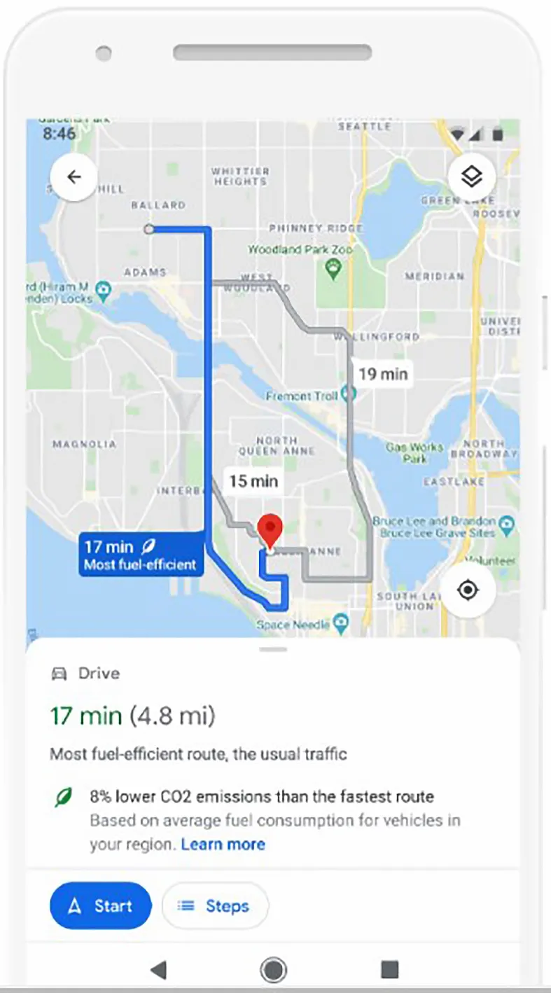 Tập đoàn Google thông báo ứng dụng bản đồ và chỉ đường Maps sẽ bắt đầu đề xuất tài xế đi theo các tuyến đường có mức khí phát thải carbon ước tính thấp nhất dựa trên mật độ giao thông, đoạn đường dốc và một số yếu tố khác.