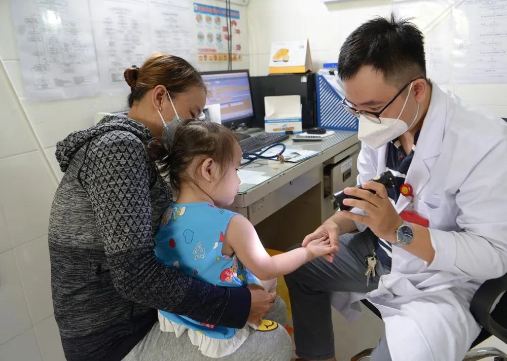 BS Trần Ngọc Xuân, Khoa Nhiễm, Bệnh viện Nhi đồng 2 (TPHCM), thăm khám cho bệnh nhi nghi mắc bệnh đậu mùa. Ảnh: QUANG HUY