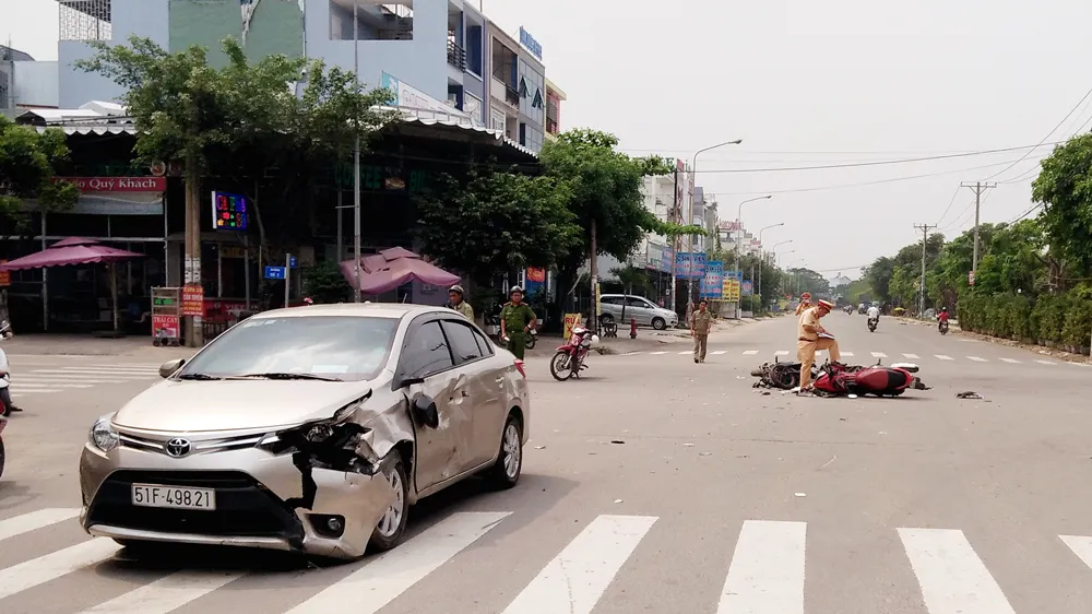 Tại hiện trường, cả 3 phương tiện đều bị hư hỏng, xe ô tô bị bể phần đầu, một số bộ phận của 2 chiếc xe máy bị bể nát văng ra khắp đường.