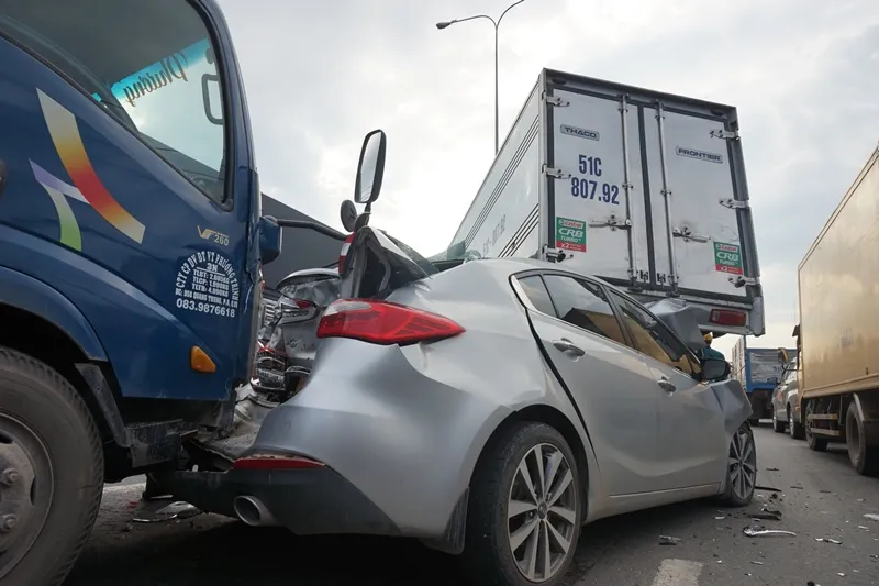 Chưa dừng lại, chiếc xe còn va chạm với mộtxe tải đông lạnh mang BKS: 54Y-2603 tạo thành chuổi tai nạn liên hoàn. Vụ va chạm khiến tài xế xe ô tô 4 chỗ kẹt trong xe được người dân đưa ra ngoài trong tình trạng hoảng loạn.