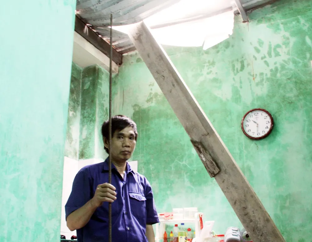 “Lúc ấy, tôi vừa xuống đến nhà vệ sinh, miếng ván rơi chệch qua nhà bếp ngay vị trí tôi vừa đi qua. Đúng là một phen hú hồn, may mắn là không bị miếng ván rơi xuống đầu…” chị Tuyền hốt hoảng kể.