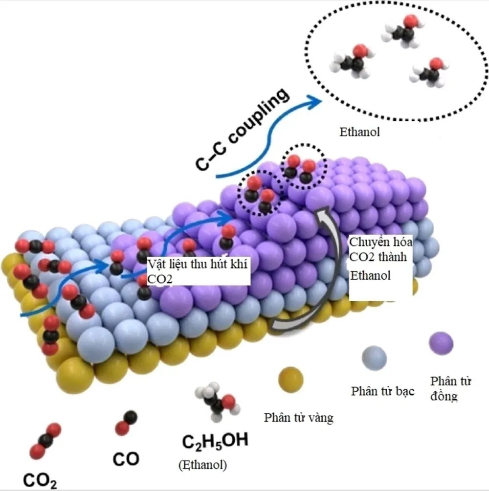 Theo nghiên cứu được công bố trên Tạp chí Nano Research, các nhà khoa học từ Đại học Thiên Tân và Viện Vật lý thuộc Viện Hàn lâm Khoa học Trung Quốc đã kết hợp 3 nguyên tố vàng, bạc, đồng để tạo thành một vật liệu cấu trúc nano hoạt động như một chất siêu xúc tác. Cấu trúc này không đối xứng về hình dạng và có khả năng tăng tốc độ phản ứng hóa học khử CO2 điện hóa, một bước quan trọng trong quá trình hút CO2 từ khí quyển và sử dụng chúng làm nguyên liệu cho các hóa chất công nghiệp. Phản ứng sử dụng điện năng để chuyển hóa khí nhà kính thành các chất khác có thể sử dụng được, bằng cách tách nguyên tử carbon ra khỏi nguyên tử oxygen.