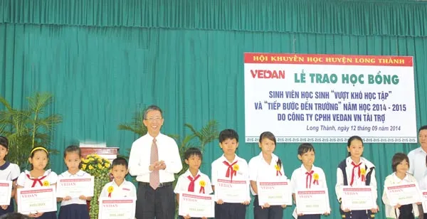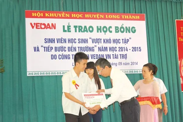 Nhằm tiếp tục thực hiện chương trình hỗ trợ cho phong trào khuyến học khuyến tài tại địa phương, kịp thời tiếp sức đến trường cho các em học sinh, sinh viên trong năm học mới (2014 - 2015). Sáng ngày 12-9-2014, Công ty CPHH Vedan Việt Nam phối hợp với Hội khuyến học huyện Long Thành tổ chức lễ trao học bổng “Vượt khó học tập” cho hơn 90 em học sinh có hoàn cảnh khó khăn, nhưng đạt kết quả học tập tốt trong năm học vừa qua và trao tặng 10 suất học bổng “Tiếp sức sinh viên” cho các em sinh viên nghèo đang học tại các trường cao đẳng, đại học trong nước.