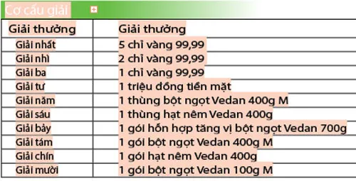 4. Cơ cấu giải thưởng (Bảng dưới):