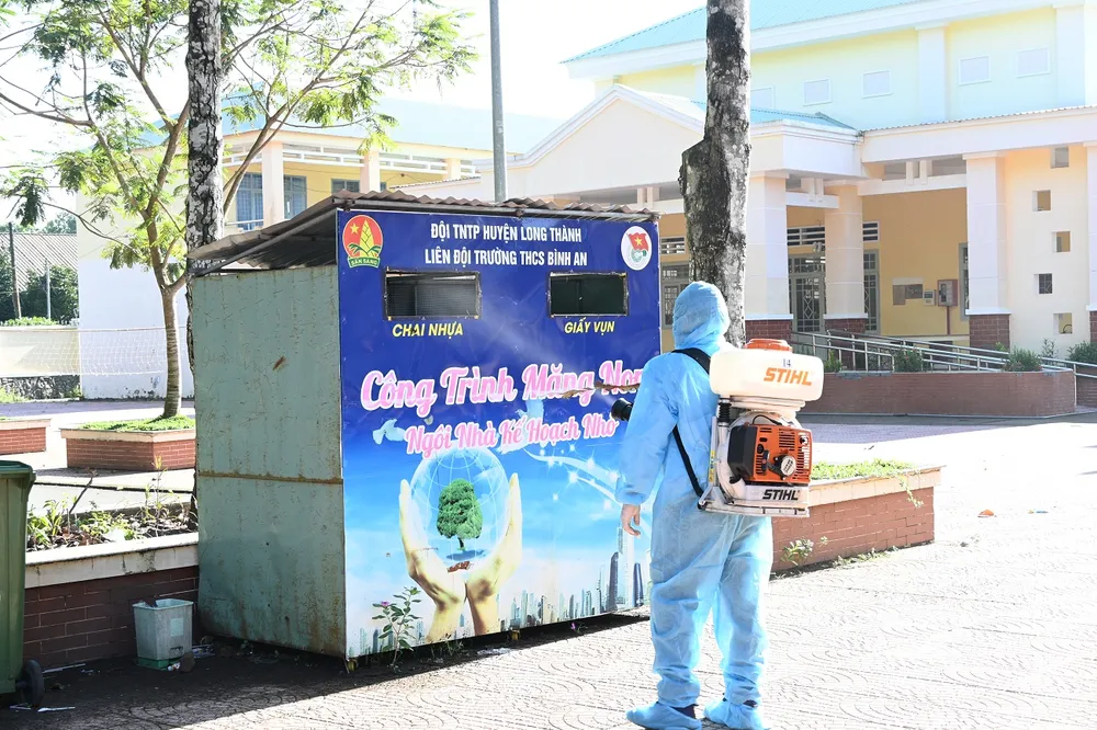 Ngoài phòng học, các khu vực ngoài trời cũng được chú trọng phun xịt thuốc triệt để |