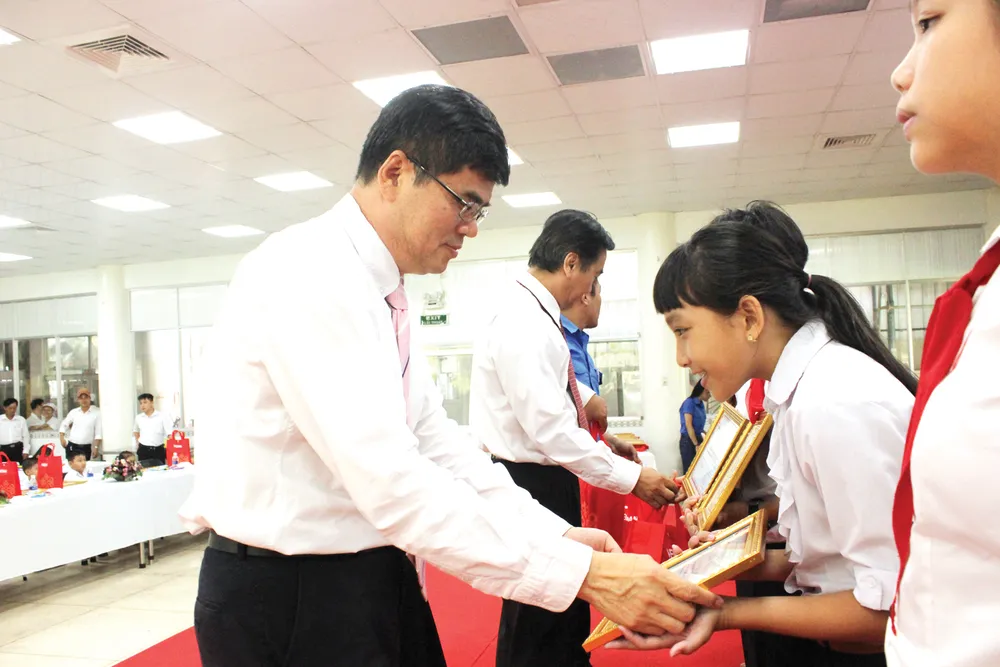 Lãnh đạo công ty và công đoàn Vedan Việt Nam trao học bổng cho các cháu
