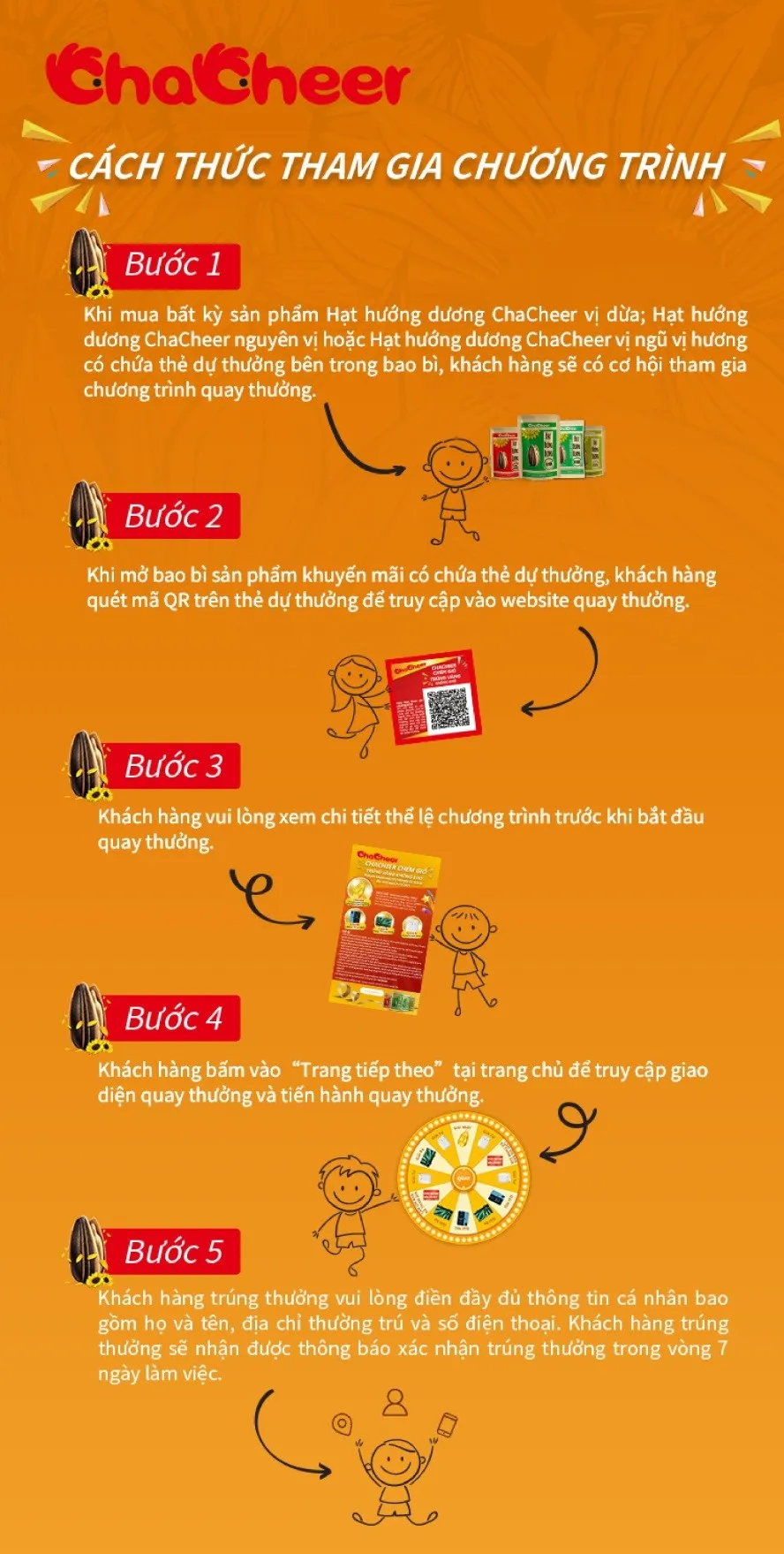 Cách thức tham gia chương trình: Khi mở bao bì sản phẩm khuyến mãi có chứa thẻ dự thưởng, khách hàng quét mã QR trên thẻ dự thưởng, truy cập vào website xem chi tiết thể lệ và làm theo hướng dẫn để tham gia quay thưởng.