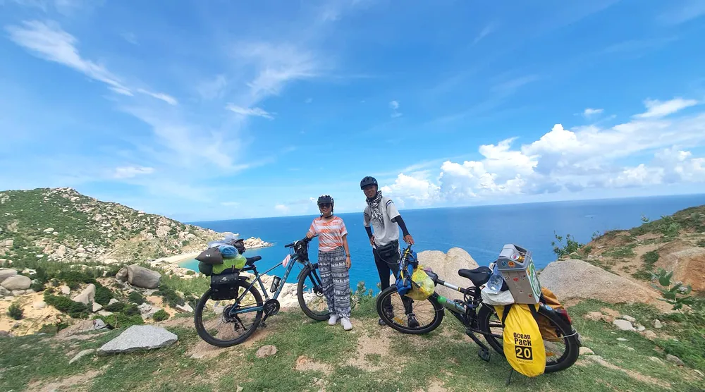 Sau 17 ngày, trung bình mỗi ngày đạp từ 80-100km men theo cung đường biển, thay vì đi quốc lộ 1A, cả hai đã vượt đèo Hải Vân và có thể về đích sớm hơn lịch trình dự kiến ban đầu là 30 ngày. Có những tối, cả hai chọn ngủ trong nhà trọ, hay xin ngủ nhờ nhà người dân. Nhiều khi, hai bạn trẻ chọn cắm trại ở những nơi có địa thế đẹp, an toàn. Cả hai thừa nhận gặp khá nhiều may mắn trên suốt hành trình và tự biết cách bảo vệ chính mình. “Em cảm nhận được tình yêu thương chất phác từ ông bà, cô chú và trẻ nhỏ ở các vùng quê. Mọi thứ thật tự nhiên. Trong lòng mình có cảm giác yêu thương, khó tả lắm, chỉ có thể cảm nhận được thôi”, Hương cho biết.