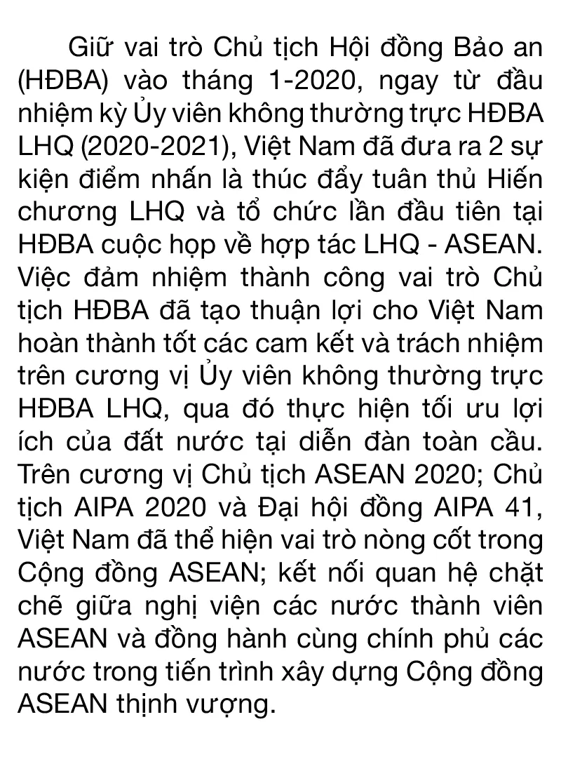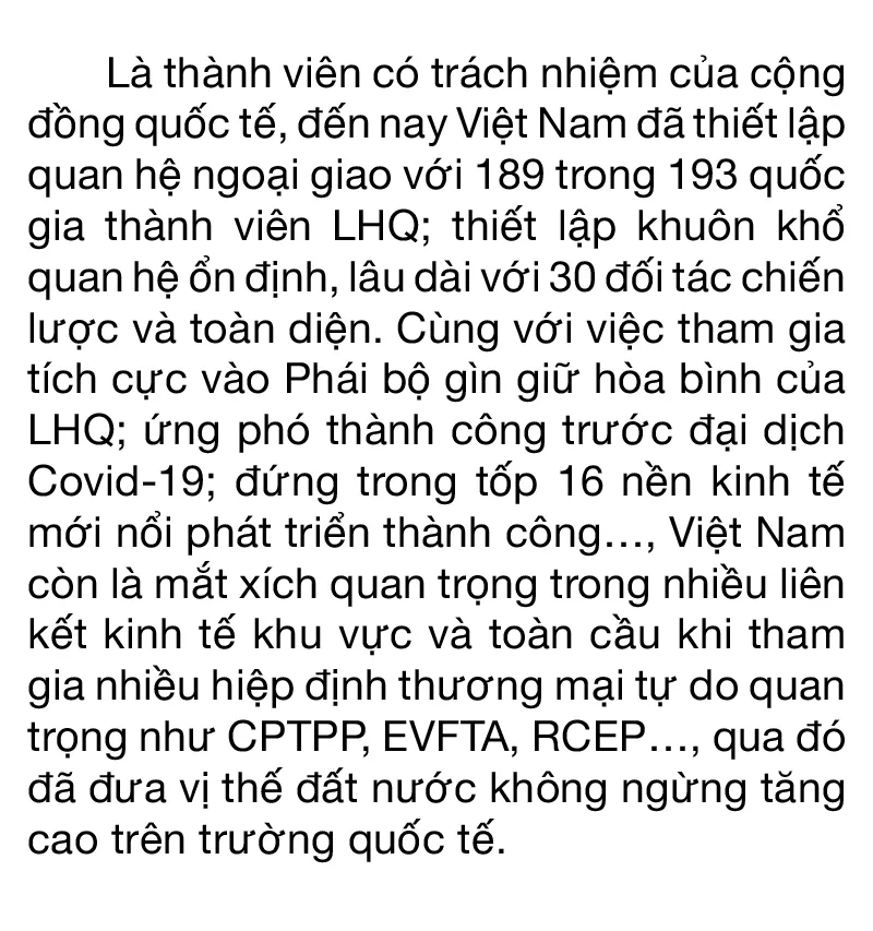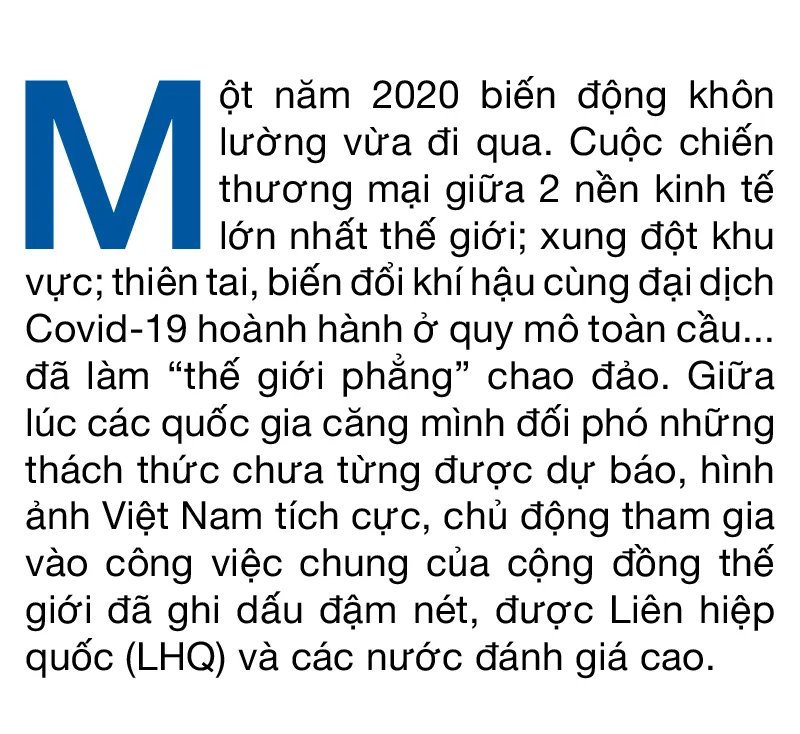 Một năm 2020 biến động khôn lường vừa đi qua. Cuộc chiến thương mại giữa 2 nền kinh tế lớn nhất thế giới; xung đột khu vực; thiên tai, biến đổi khí hậu cùng đại dịch Covid-19 hoành hành ở quy mô toàn cầu... đã làm “thế giới phẳng” chao đảo. Giữa lúc các quốc gia căng mình đối phó những thách thức chưa từng được dự báo, hình ảnh Việt Nam tích cực, chủ động tham gia vào công việc chung của cộng đồng thế giới đã ghi dấu đậm nét, được Liên hiệp quốc (LHQ) và các nước đánh giá cao.