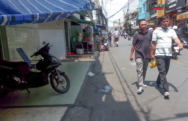 Vỉa hè ở hai bên đường Nguyễn Thượng Hiền, quận 3 đã “biến mất”, người dân ở hai bên đường đã tự ý cải tạo vỉa hè, biến vỉa hè thành của riêng. Ngay cả những lúc không buôn bán, người đi bộ cũng không có vỉa hè để đi