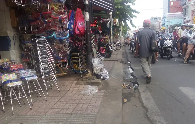 (SGGPO).- Trong khi quận 1 đang ra sức lấy lại vỉa hè dành cho người đi bộ thì vỉa hè trên nhiều tuyến đường ở các quận khác vẫn đang bị chiếm dụng để kinh doanh, buôn bán, giữ xe, buộc người đi bộ phải đi dưới lòng đường. Hình ảnh ghi nhận trong chiều ngày 2-3.