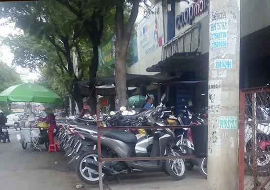 Phía trước Co.opmart đường Nguyễn Duy Dương vỉa hè bị chiếm trọn để làm chỗ giữ xe.