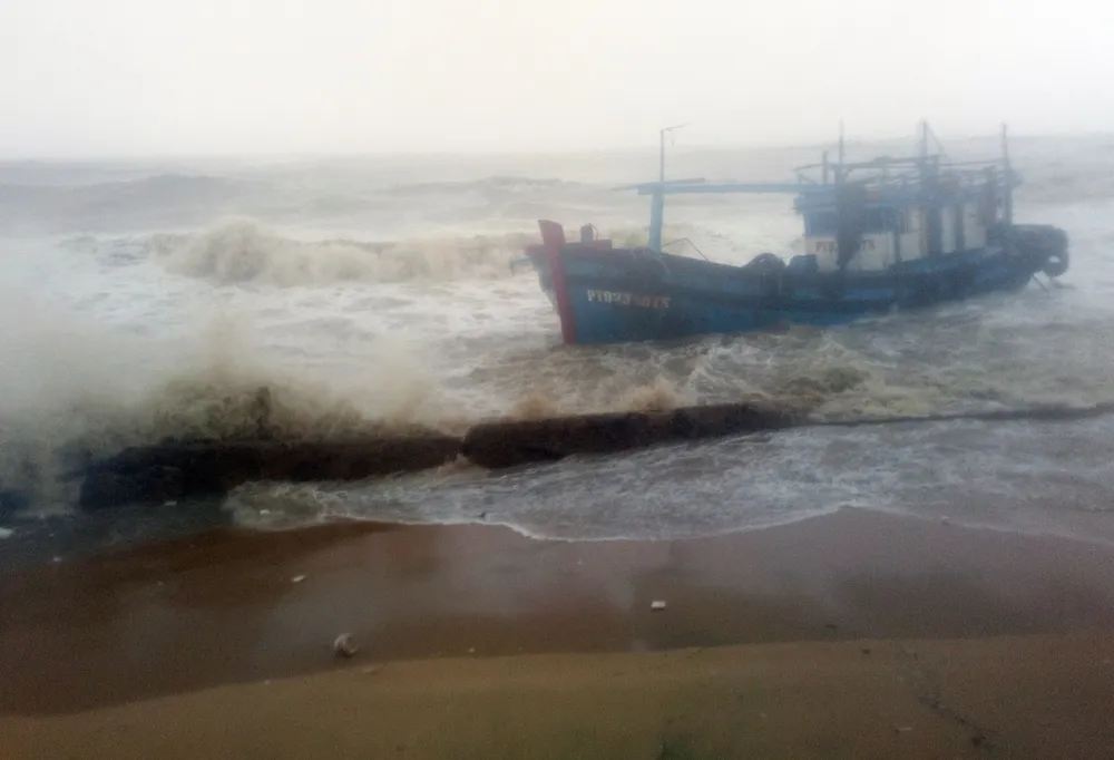 Nhiều tàu cá ở Phú Yên bị đứt neo từ đêm 3-11 kéo dạt vào bãi biển Quy Nhơn. Ảnh: NGỌC OAI