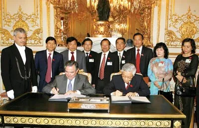 Tháng 6-2008, chuyến thăm 4 nước châu Âu (Hungari, Bungari, Rumani, Pháp) của Chủ tịch Quốc hội Nguyễn Phú Trọng nhằm khẳng định một lần nữa: Việt Nam coi Liên minh châu Âu là đối tác rất quan trọng. Tại Pháp, Chủ tịch Thượng viện CH Pháp Christian Poncelet nhấn mạnh với Chủ tịch Quốc hội Nguyễn Phú Trọng: Việt Nam hoàn toàn có thể tin tưởng vào sự ủng hộ của Pháp trong quan hệ với EU. Trong ảnh: Chủ tịch Quốc hội Pháp Bernard Accoyer (ngồi, bên trái) và Chủ tịch Quốc hội nước CH XHCN Việt Nam Nguyễn Phú Trọng (ngồi, bên phải) ký thỏa thuận hợp tác giữa Quốc hội hai nước.