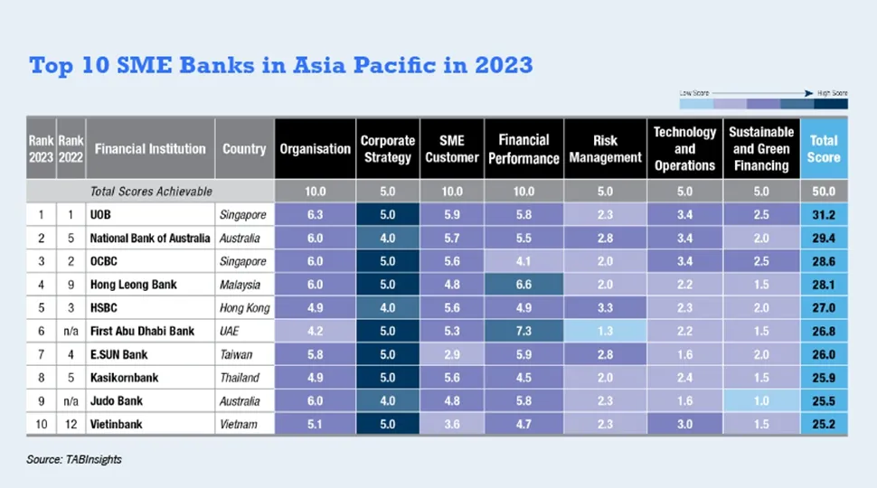 Tại Việt Nam, VietinBank đã xuất sắc vượt qua nhiều ứng cử viên sáng giá để chinh phục Hội đồng giám khảo của The Asian Banker bằng chất lượng SPDV. Với điểm số được đánh giá vượt trội, The Asian Banker đã trao tặng VietinBank Giải thưởng Ngân hàng SME tốt nhất Việt Nam. Cũng với điểm số này, VietinBank đã lọt vào Top 10 Ngân hàng SME tốt nhất khu vực Châu Á -Thái Bình Dương, tăng 2 bậc so với năm 2022.