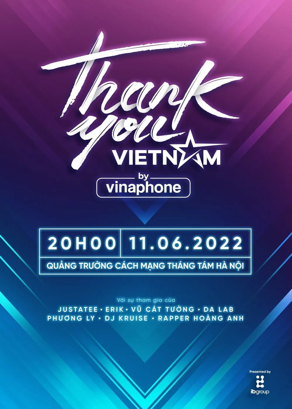 “Thank you, Vietnam” là sự kiện mở màn chuỗi hoạt động kỷ niệm 26 năm thành lập của nhà mạng VinaPhone, được đầu tư với quy mô hoành tráng, quy tụ các nghệ sĩ nổi tiếng trong giới trẻ hiện nay như JustaTee, Erik, Vũ Cát Tường, Dalab, Phương Ly, DJ Tuấn Kruise, Rapper Hoàng Anh…