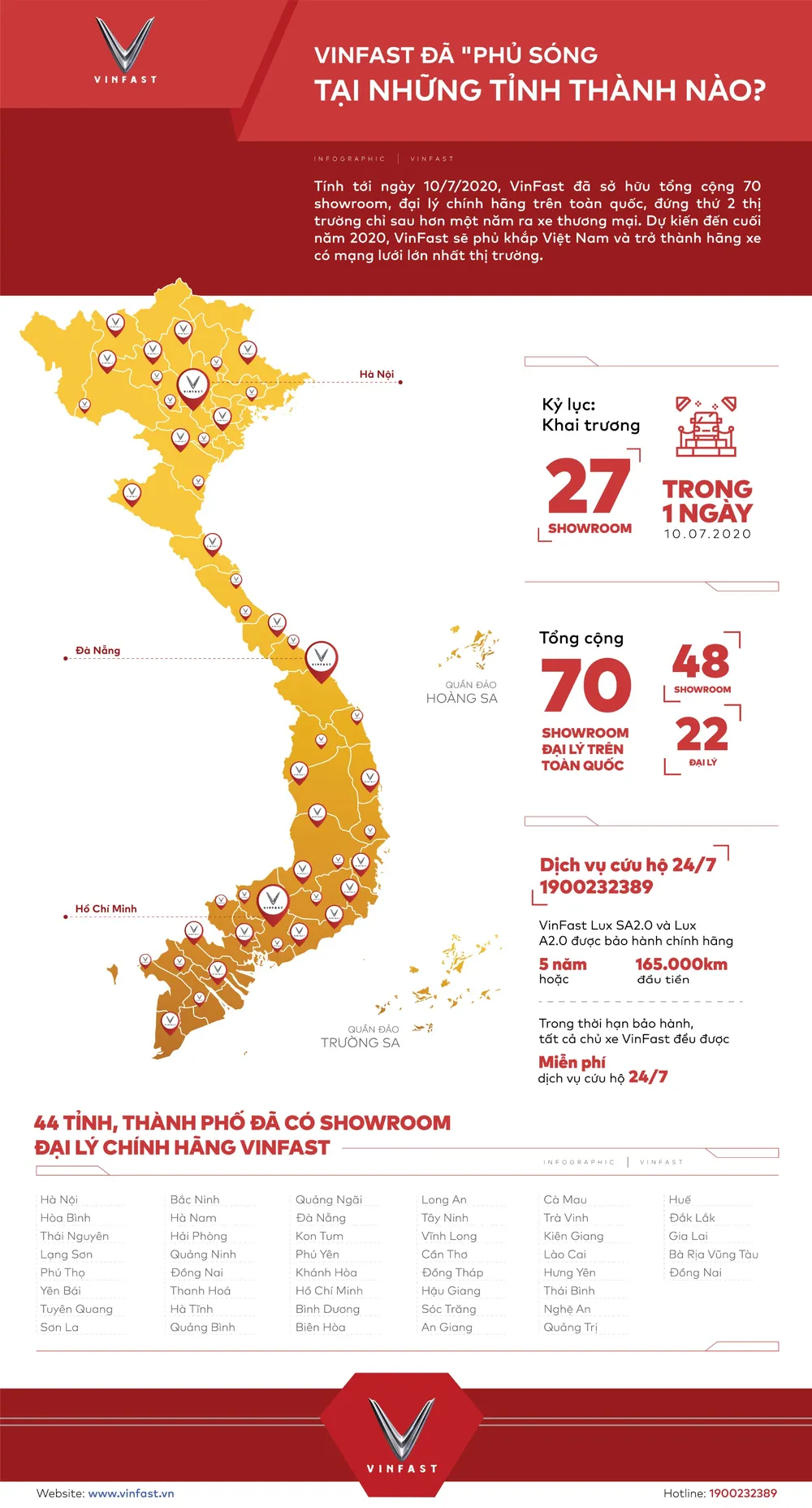 Sau khi lập kỷ lục khai trương đồng loạt 27 showroom trong một ngày, VinFast hiện sở hữu hệ thống 70 showroom, đại lý chính hãng tại 44 tỉnh, thành phố, là hãng xe có mạng lưới lớn thứ 2 thị trường chỉ sau 1 năm ra xe thương mại. Theo kế hoạch, đến cuối năm 2020, VinFast sẽ “phủ sóng” tại tất cả 63 tỉnh, thành.