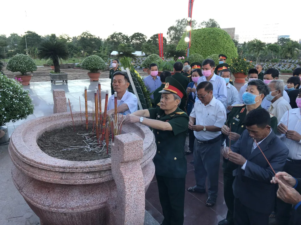 Các đại biểu, gia đình thân nhân, đồng đội đồng chí trong Ban liên lạc Cựu chiến binh trung đoàn 1 thắp hương tại Nghĩa trang liệt sĩ tỉnh Vĩnh Long