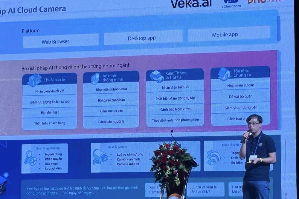 Trong đó, Cloud Camera AI là bộ giải pháp camera ứng dụng trí tuệ nhân tạo do Veka.ai (tiền thân là vCloudcam) phát triển cho từng nhóm ngành: Ngân hàng, Chuỗi bán lẻ, An ninh, Giao thông và Tòa nhà/ chung cư, Nhà máy, Khu công nghiệp. Với chức năng phân tích và đưa ra cảnh báo, tăng cường an ninh và phòng ngừa các rủi ro có thể xảy ra, giải pháp này giúp vận hành, quản lý cửa hàng, khu dân cư, đô thị hiệu quả, tối ưu trải nghiệm khách hàng, từ đó đẩy nhanh quá trình chuyển đổi số cho doanh nghiệp lẫn thành phố tại Việt Nam.