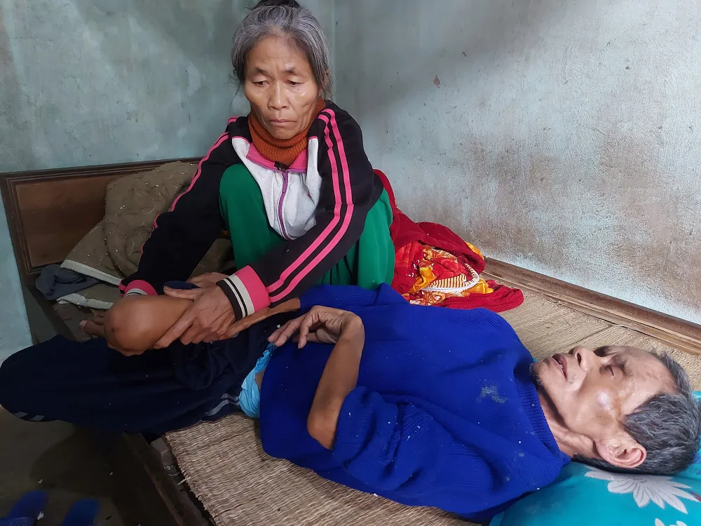 Mọi sinh hoạt từ vệ sinh cá nhân đến ăn uống đều phụ thuộc vào sự chăm sóc của bà Tẻo và người con trai út. Bà Tẻo cũng chẳng khá hơn. Bà bị bệnh tiểu đường rất nặng cả chục năm qua, lại điếc cả hai tai. Đã vậy, tháng 12-2022, trong lần vào viện chăm chồng, bà bị ngã, gãy chân trái, đến nay vẫn chưa lành.