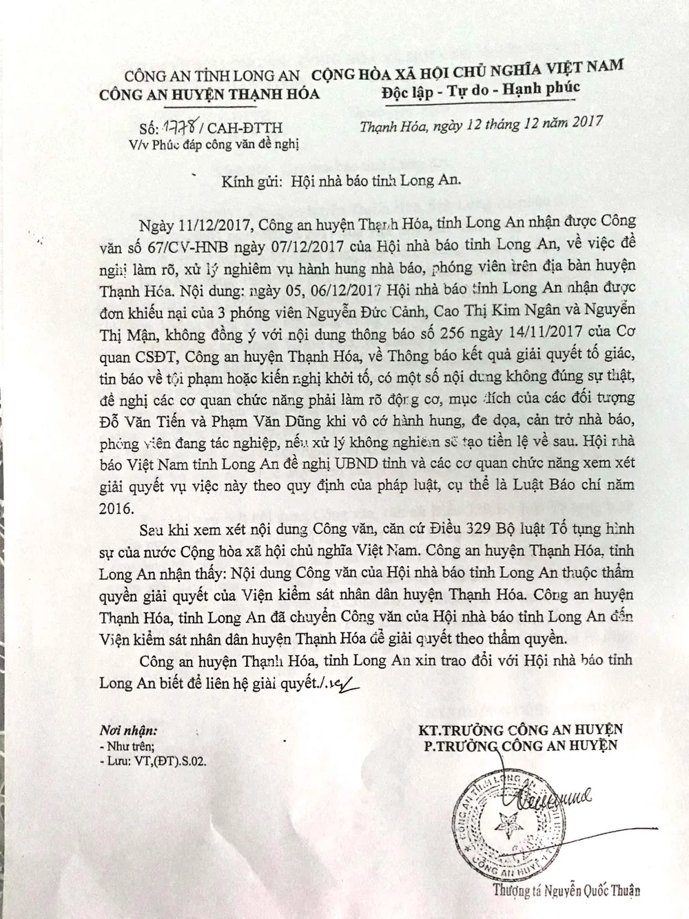 Ngày 15-12, bà Trần Thị Vẹn, Chánh Văn phòng Hội nhà báo tỉnh Long An, cho biết: Do mới nhận được Công văn phúc đáp của Công an huyện Thạnh Hóa, nên chờ Ban Thường vụ Hội nhà báo tỉnh họp rồi mới có ý kiến tiếp về vụ này. Cũng theo bà Vẹn, sau khi tiếp nhận đơn thư của 3 nhà báo Phạm Đức Cảnh, Cao Thị Kim Ngân (Đài PT-TH Long An) và Nguyễn Thị Mận (Báo Long An) khiếu nại về việc không đồng ý với nhiều nội dung, lý do trong văn bản thông báo không khởi tố vụ án hình sự của Cơ quan CSĐT Công an huyện Thạnh Hóa, Hội Nhà báo tỉnh Long An đã có văn bản gửi UBND tỉnh Long An, Ban Tuyên giáo Tỉnh ủy, Sở Thông tin và Truyền thông, Công an tỉnh, Công an huyện Thạnh Hóa đề nghị làm rõ, xử lý nghiêm vụ hành hung 3 phóng viên Báo, Đài Long An vào sáng ngày 27-9-2017. Văn bản cũng có nội dung phản ứng với văn bản thông báo của Cơ quan Cảnh sát điều tra Công an huyện Thạnh Hóa.