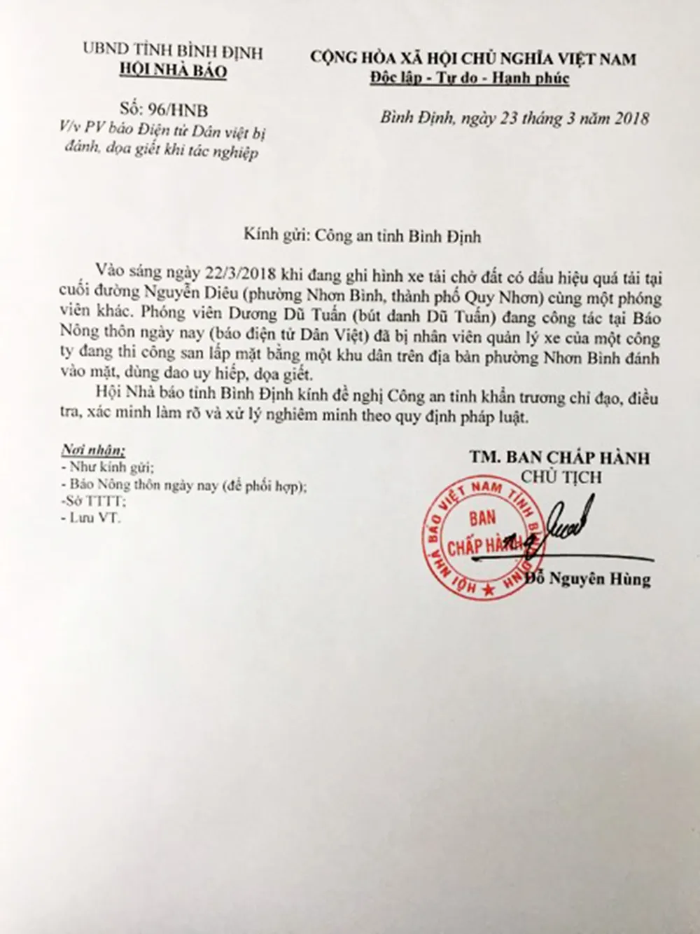 Công văn do ông Đỗ Nguyên Hùng, Chủ tịch Hội Nhà báo tỉnh Bình Định ký, lên tiếng yêu cầu khẩn trương điều tra, xác minh và xử lý nghiêm minh theo quy định pháp luật đối với sự việc PV Dương Dũ Tuấn bị côn đồ cầm dao đánh, dọa giết.