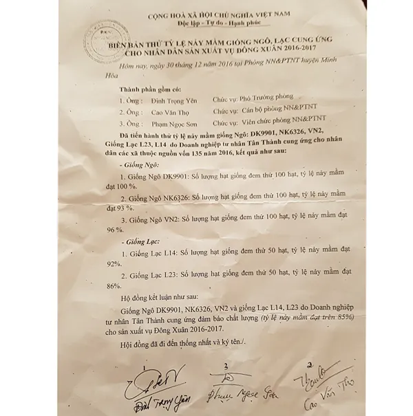 Biên bản thử tỷ lệ hạt đậu phộng giống của công ty Tân Thành tại phòng Nông nghiệp huyện Minh Hóa. Khuôn viên phòng này nằm trong trụ sở UBND huyện, không có mảnh đất thử hạt giống nào nên biên bản ghi được lập ngay tại phòng
