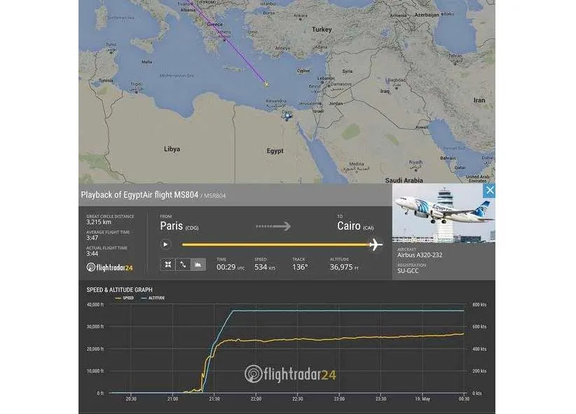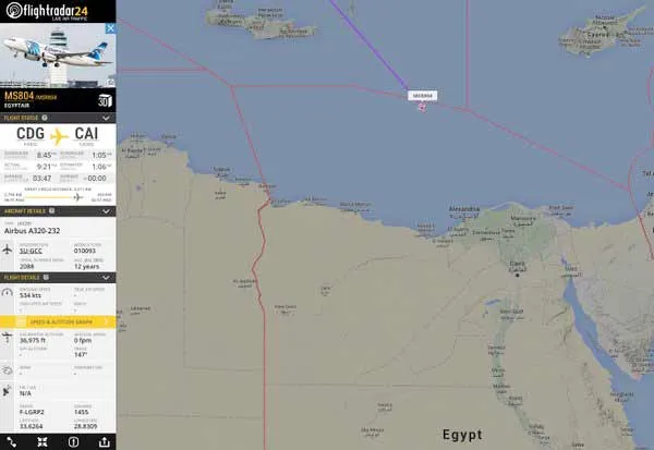 Trang web theo dõi máy bay Flightradar24 ghi nhận dữ liệu của MS804 trước khi máy bay mất tích