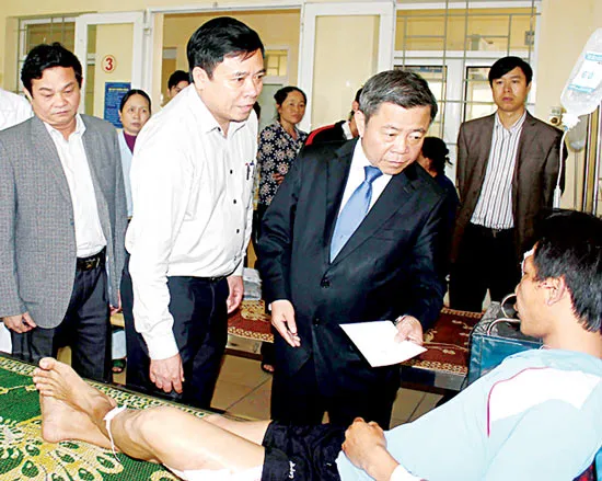 Bí thư Tỉnh ủy, Chủ tịch UBND tỉnh Hà Tĩnh Võ Kim Cự thăm hỏi động viên các nạn nhân đang điều trị tại Bệnh viện Đa khoa Hà Tĩnh.