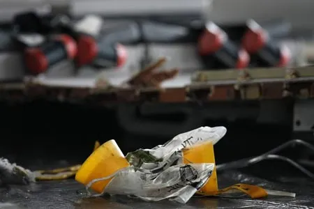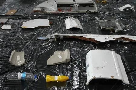 Những mảnh vỡ đầu tiên thu được từ chiếc máy bay lâm nạn đêm 31/5 của hãng Air France đang được trưng bày tại căn cứ không quân Racife của Brazil.