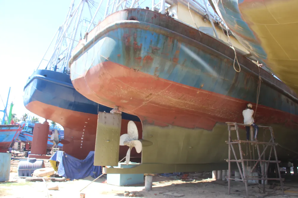 Sau khi xảy ra sự cố tàu vỏ thép mới đóng chưa kịp đánh bắt đã hư hỏng, nằm bờ sửa chữa... từ đó đến nay 20 ngư chủ tàu Bình Định ... họp đến ngán ngẩm. Ảnh: NGỌC OAI
