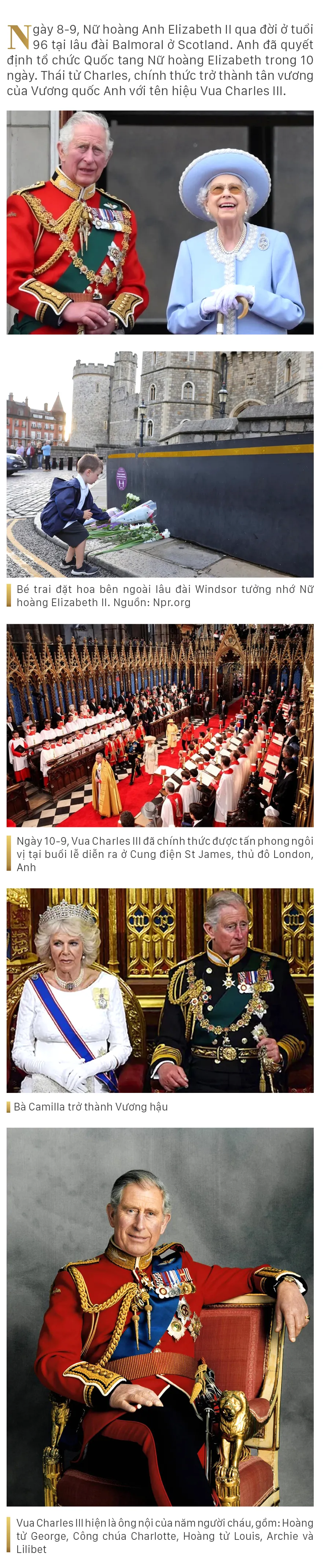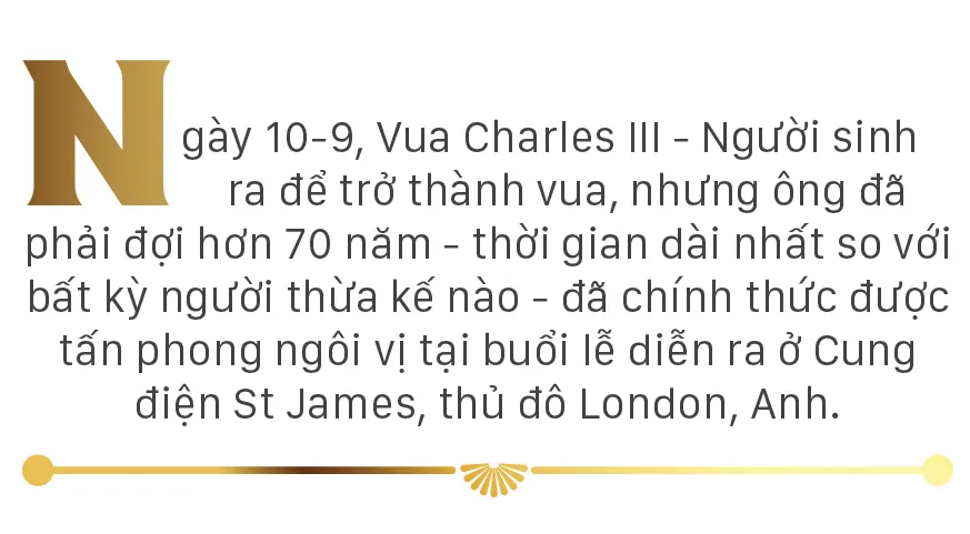 Ngày 10-9, Vua Charles III – Người sinh ra để trở thành vua, nhưng ông đã phải đợi hơn 70 năm – thời gian dài nhất so với bất kỳ người thừa kế nào - đã chính thức được tấn phong ngôi vị tại buổi lễ diễn ra ở Cung điện St James, thủ đô London, Anh.