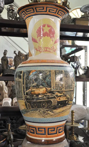 Bình gốm sứ vẽ hình xe tăng húc đổ cổng Dinh Độc Lập, kỷ niệm 10 năm Ngày giải phóng miền Nam