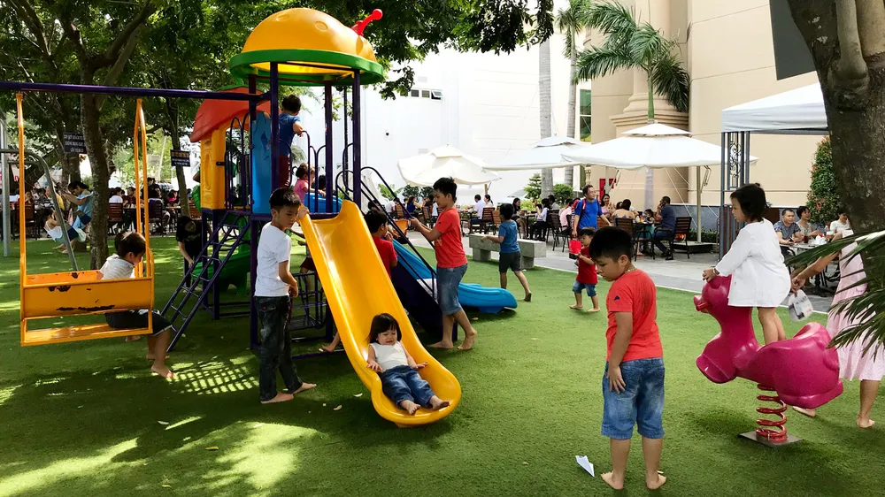Các bé vui chơi trong khuôn viên quán cà phê cùng gia đình tại khách sạn Tân Sơn Nhất. Ảnh: VIỆT DŨNG