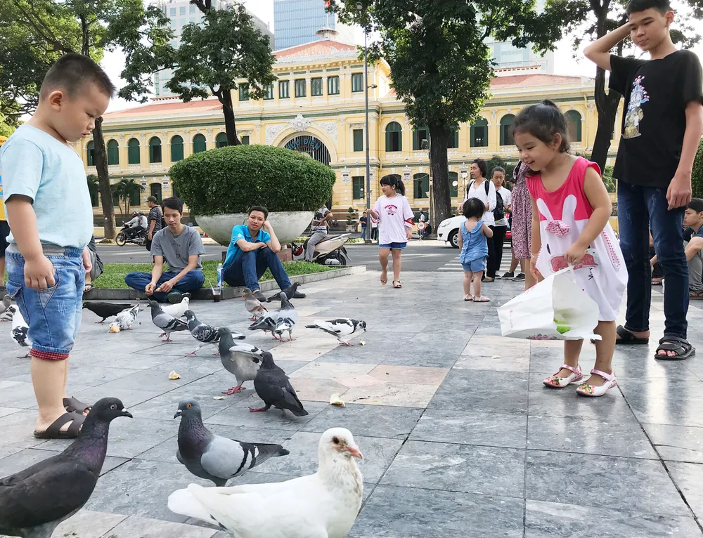 Người dân vui chơi khu vực Nhà thờ Đức Bà sáng cuối tuần. Ảnh: VIỆT DŨNG