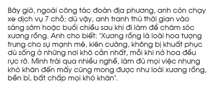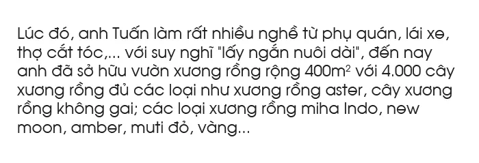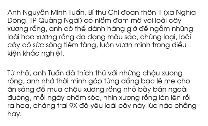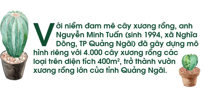 Với niềm đam mê cây xương rồng, anh Nguyễn Minh Tuấn (sinh 1994, xã Nghĩa Dõng, TP Quảng Ngãi) đã gây dựng mô hình riêng với 4.000 cây xương rồng các loại trên diện tích 400m2, trở thành vườn xương rồng lớn của tỉnh Quảng Ngãi.