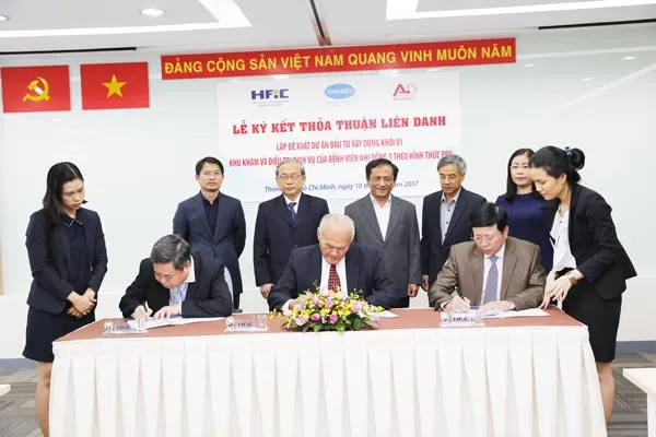 (SGGPO).- Sáng nay, 18-4, Công ty đầu tư tài chính nhà nước TPHCM (HFIC), Công ty Cổ phần Đầu tư xây dựng An Điền (ANDIENCO) cùng Tổng Công ty Thiết bị Y tế Việt Nam (VINAMED) đã ký thỏa thuận hợp tác liên danh giữa HFIC và ANDIENCO - VINAMED nhằm mục đích góp vốn hình thành một liên danh đủ năng lực để lập đề xuất dự án, lập báo cáo nghiên cứu khả thi, tham gia lựa chọn nhà đầu tư và thực hiện đầu tư Dự án Xây dựng khối 1 – Khu khám và điều trị dịch vụ của Bệnh viện Nhi đồng 1.