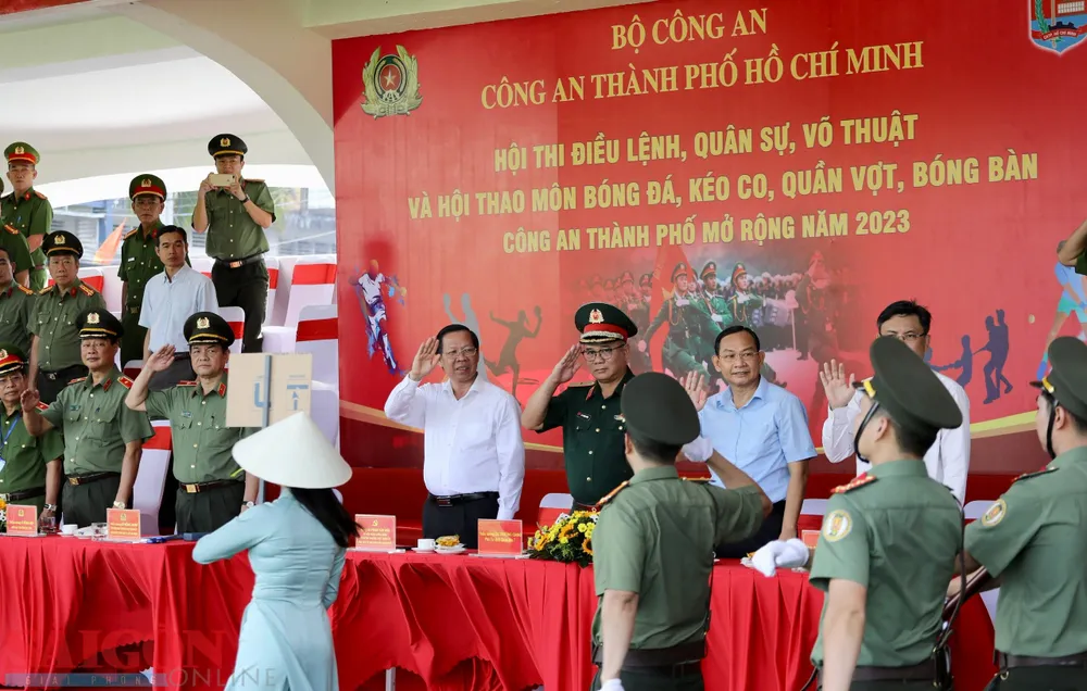 Chủ tịch UBND TPHCM Phan Văn Mãi cùng các đồng chí lãnh đạo dự hội thi điều lệnh, quân sự, võ thuật và hội thao Công an TPHCM mở rộng năm 2023 tại Trung tâm Thể thao Công an TPHCM. Ảnh: DŨNG PHƯƠNG |