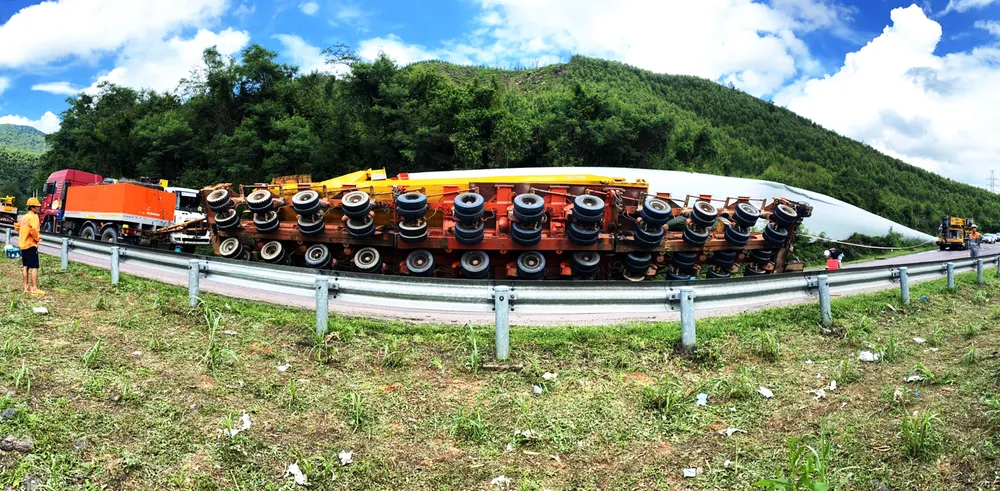 Phương tiện vận chuyển thiết bị điện gió thuộc Công ty CP Vận tải đa phương thức Vietranstimex, vận chuyển thiết bị điện gió từ tỉnh Bình Định phục vụ cho Dự án Nhà máy điện gió Hưng Hải Gia Lai.