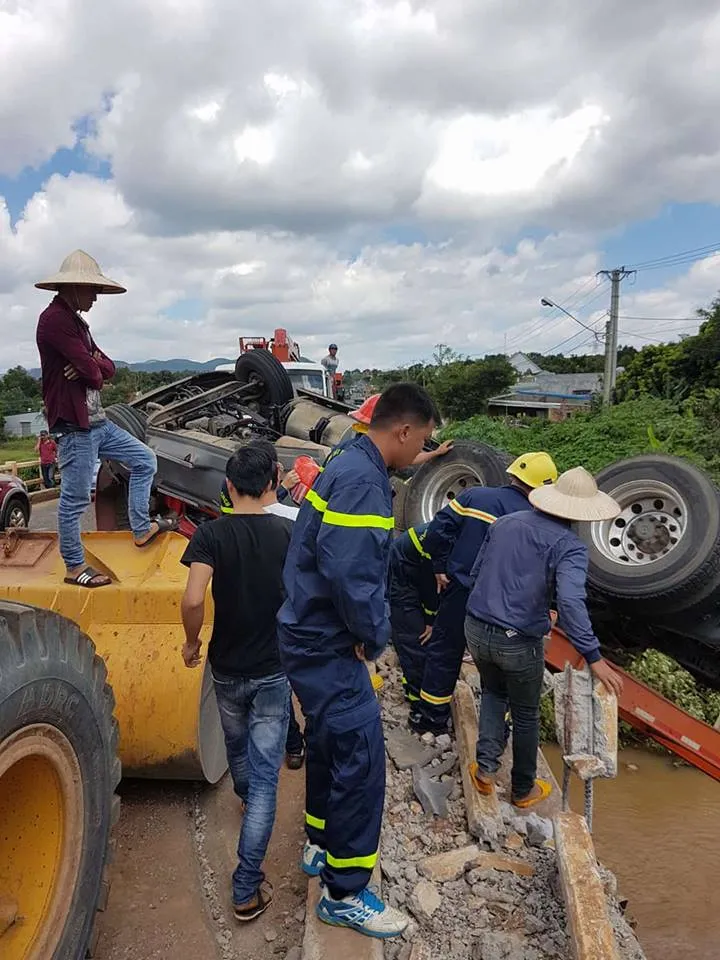 Tai nạn làm rơ móc lật nghiêng xuống suối, còn một phần đầu xe mắc kẹt trên thân cầu. Tài xế Nguyễn Văn Thông (32 tuổi, quê Bình Định) bị kẹt trong cabin và tử vong sau đó.