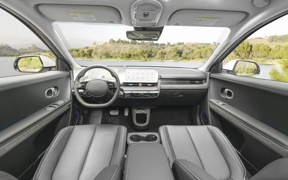 IONIQ 5 sở hữu không gian nội thất được Hyundai gọi là “Smart Living Space” - một không gian thông minh. Điểm tạo ấn tượng của nội thất IONIQ 5 là bệ tỳ tay trung tâm di động (Universal Island) sáng tạo có thể trượt di động hành trình 140mm, giúp hành khách có thêm không gian khi sử dụng xe. Bảng táp lô của Hyundai IONIQ 5 được thiết kế theo phong cách tối giản Minimalism loại bỏ các chi tiết thừa, kết hợp cùng những công nghệ hiện đại hàng đầu… Tính năng Vehicle to Load (V2L) giúp xe có khả năng cung cấp điện cho các thiết bị điện dân dụng thông qua hệ thống ổ cắm trên xe. Công suất tối đa của hệ thống này đáp ứng được đạt tới 3.600W, đủ đáp ứng cho 1 dàn âm thanh biểu diễn ngoài trời cỡ vừa hoặc các thiết bị điện cho hoạt động camping…