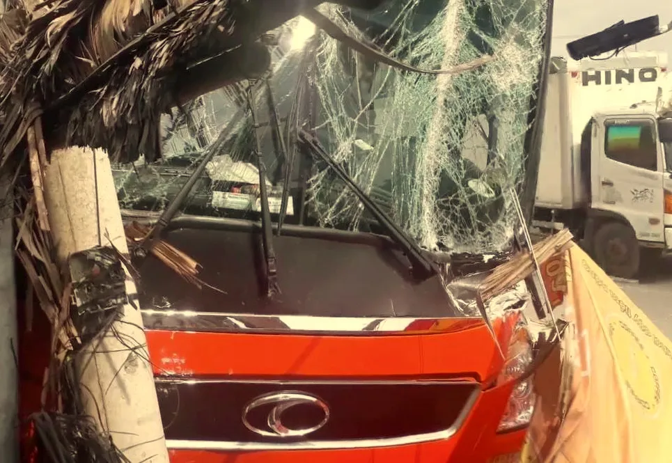 Riêng chiếc ô tô khách mang BKS 51B-311.12 của nhà xe Phương Trang bị vỡ kính trước, đầu xe móp méo, biến dạng. Vụ va chạm khiến xe khách Phương Trang đâm thẳng vào một quán cơm ven đường, tông ngã trụ điện rồi mới dừng lại.