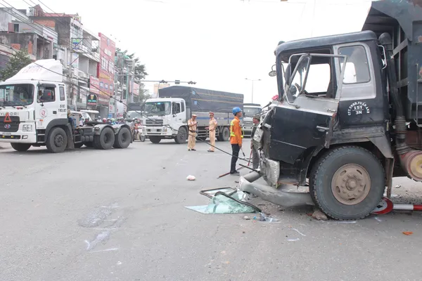 Tại hiện trường xe tải bị bể móp phần đầu, tài xế bị kẹt trong cabin phải nhờ người dân đưa ra ngoài, may mắn chỉ bị thương nhẹ.