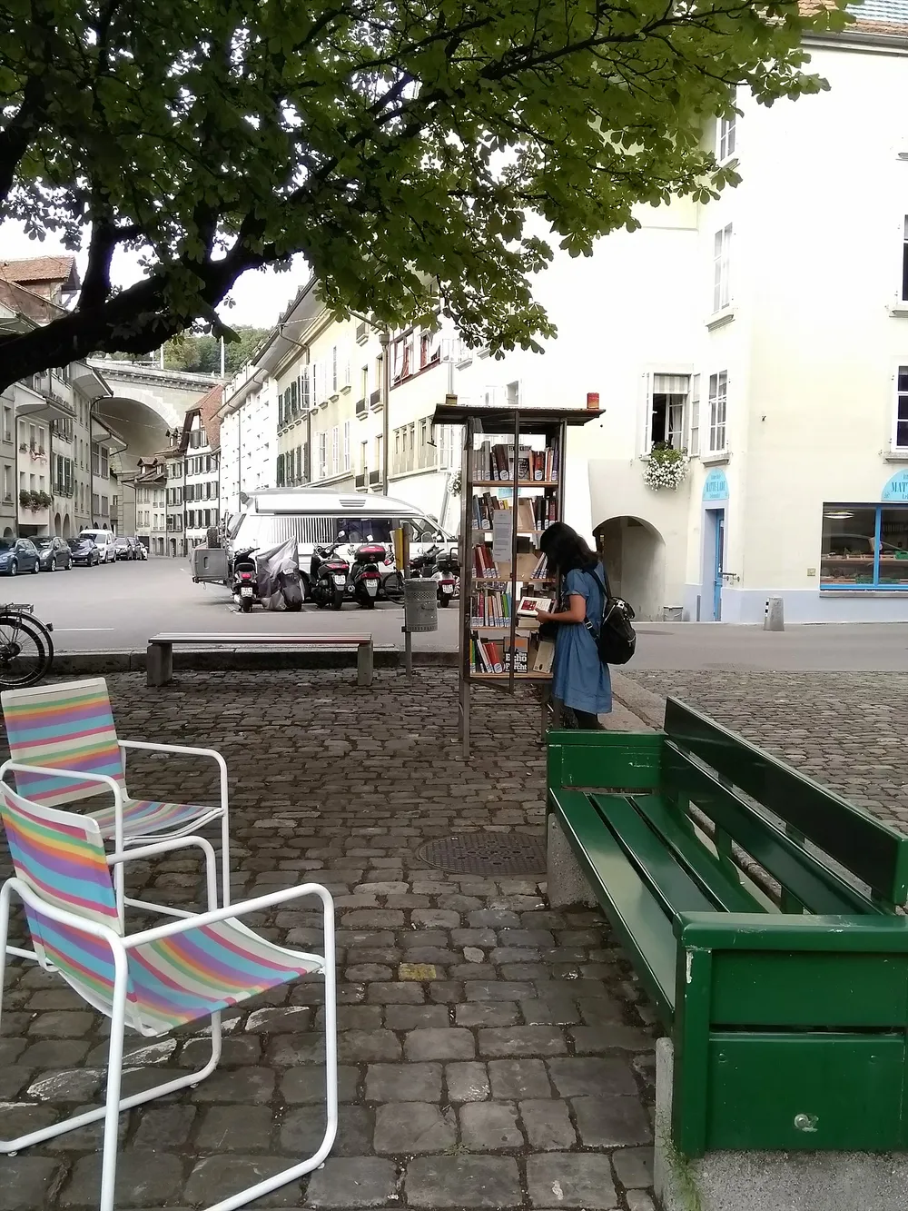 Sắp đặt theo chủ tâm hay tình cờ, những nẻo đường vào nhà chữ ở châu Âu thường thư giãn, giản dị và đời thường đến bất ngờ. Ấy là khi chân tôi đã mỏi, mắt đã mệt vì ngày dài ngắm cảnh ở TP Bern của Thụy Sĩ. Chỉ muốn tìm một góc phố nhỏ, ngồi nghỉ dưới ghế gỗ nương bóng tàng cây cổ. Định bụng thiu thiu trong gió nhẹ và tiếng nhạc róc rách từ nguồn nước trong vắt chảy lộ thiên trên mặt phố. Thế mà người Thụy Sĩ cũng không để cho tôi yên. Dưới bóng mát của tàng cây, nổi lên một chiếc tủ kính mái sắt chứa năm tầng sách. Tiểu thuyết tiếng Anh, sách khoa học - du lịch bằng tiếng Pháp, Đức... đủ cả. Lại mở tủ, với tay chọn một cuốn sách, nằm xoài trên ghế mềm và tiếp tục chìm vào nhà chữ.