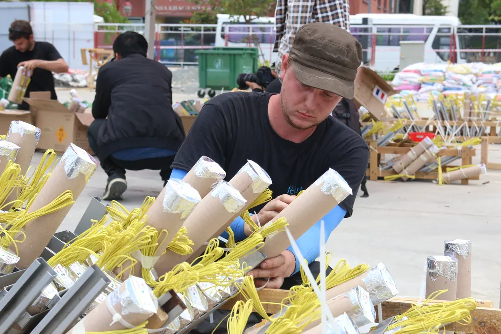 Đội pháo hoa Pháp đang hoàn tất công đoạn cuối cùng của việc lắp đặt hệ thống bắn pháo hoa