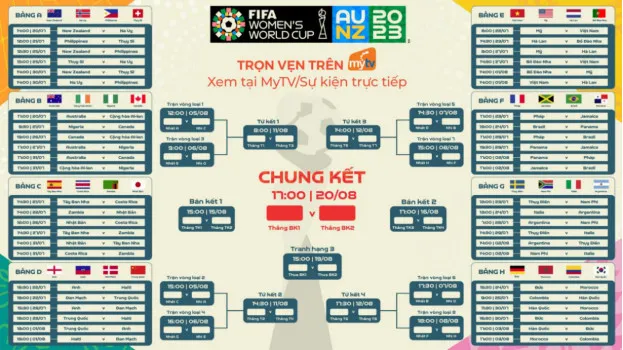 Khán giả đừng bỏ lỡ VCK FIFA World Cup Nữ 2023 từ ngày 20-7 đến ngày 20-8-2023, trực tiếp và trọn vẹn trên mục MyTV/Sự kiện trực tiếp của Truyền hình MyTV, với các nền tảng: SmartTV, SmartBox, Smartphone/Tablet (https://mytv.com.vn/tai-ve) và Web app https://mytv.com.vn.