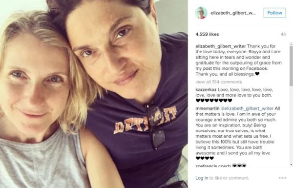 Elizabeth Gilbert (trái) thừa nhận tình yêu đồng tính với Rayya Elias. Ảnh: FBNV
