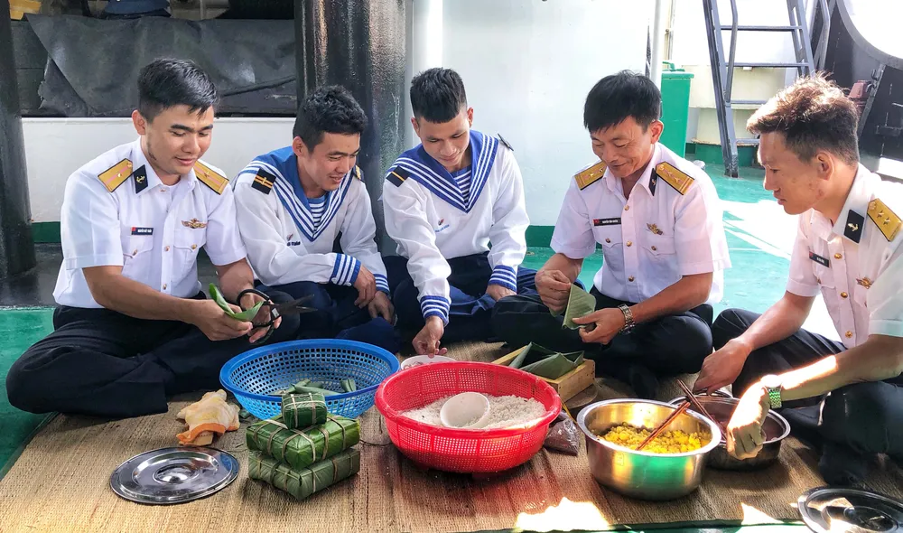 Cán bộ chiến sĩ trên tàu 954, gói bánh chưng. Dù không có đôi bàn tay phụ nữ nhưng bánh vẫn vuông và đẹp. Ảnh: TÍN HUY