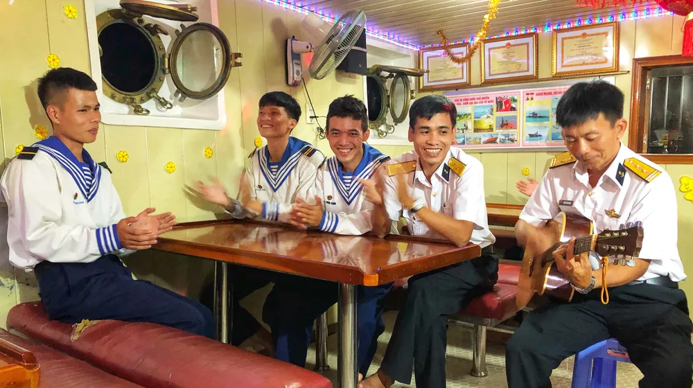 Sau khoảng thời gian làm nhiệm vụ, cán bộ, chiến sĩ quây quần ca hát cùng với tiếng đàn guitar. Ảnh: TÍN HUY
